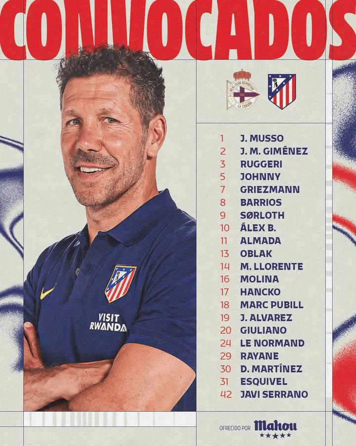 前锋:7-格列兹曼、9-瑟尔洛特、10-巴埃纳、11-阿尔马达、19-阿尔瓦雷斯、20-朱利亚诺-西蒙尼